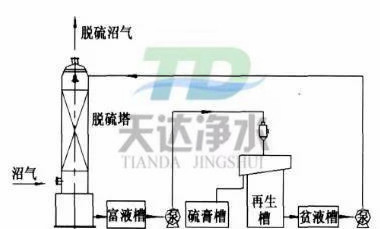 濕法脫硫是將沼氣送入洗滌塔,經(jīng)堿性溶液洗滌吸收后流出,洗滌液進(jìn)入富液槽、再生槽,通過(guò)使用化學(xué)藥劑方法催化、氧化,最終將硫化物轉(zhuǎn)化為單質(zhì)硫(硫泡沫),吸收液可以再生循環(huán)使用。